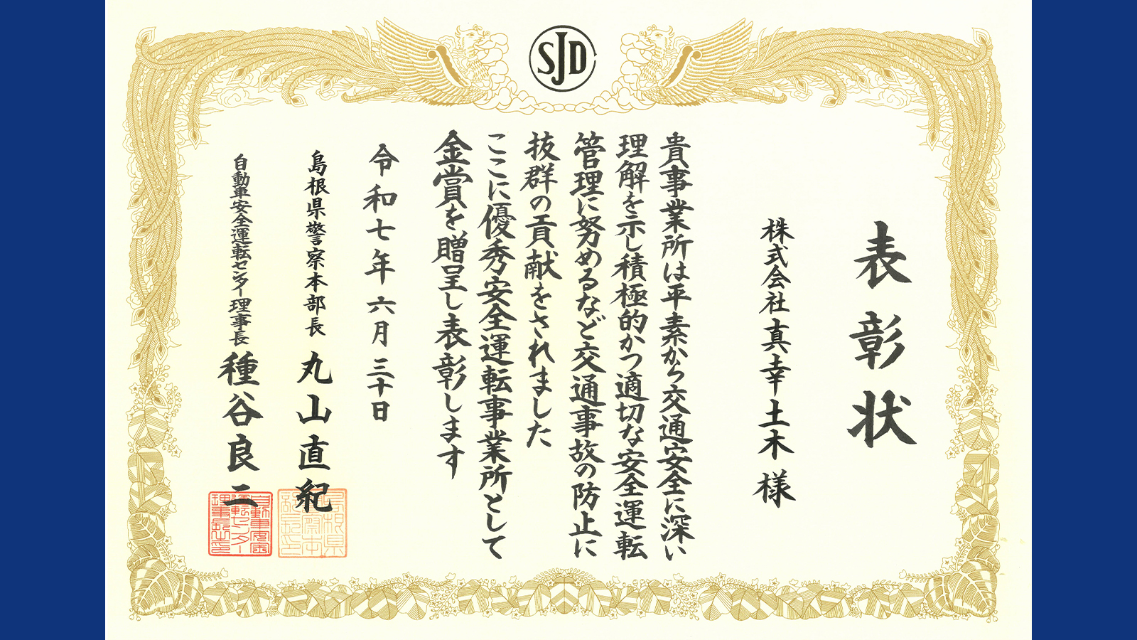 島根県警察・自動車安全運転センターより優秀安全運転事業所として金賞受賞しました。