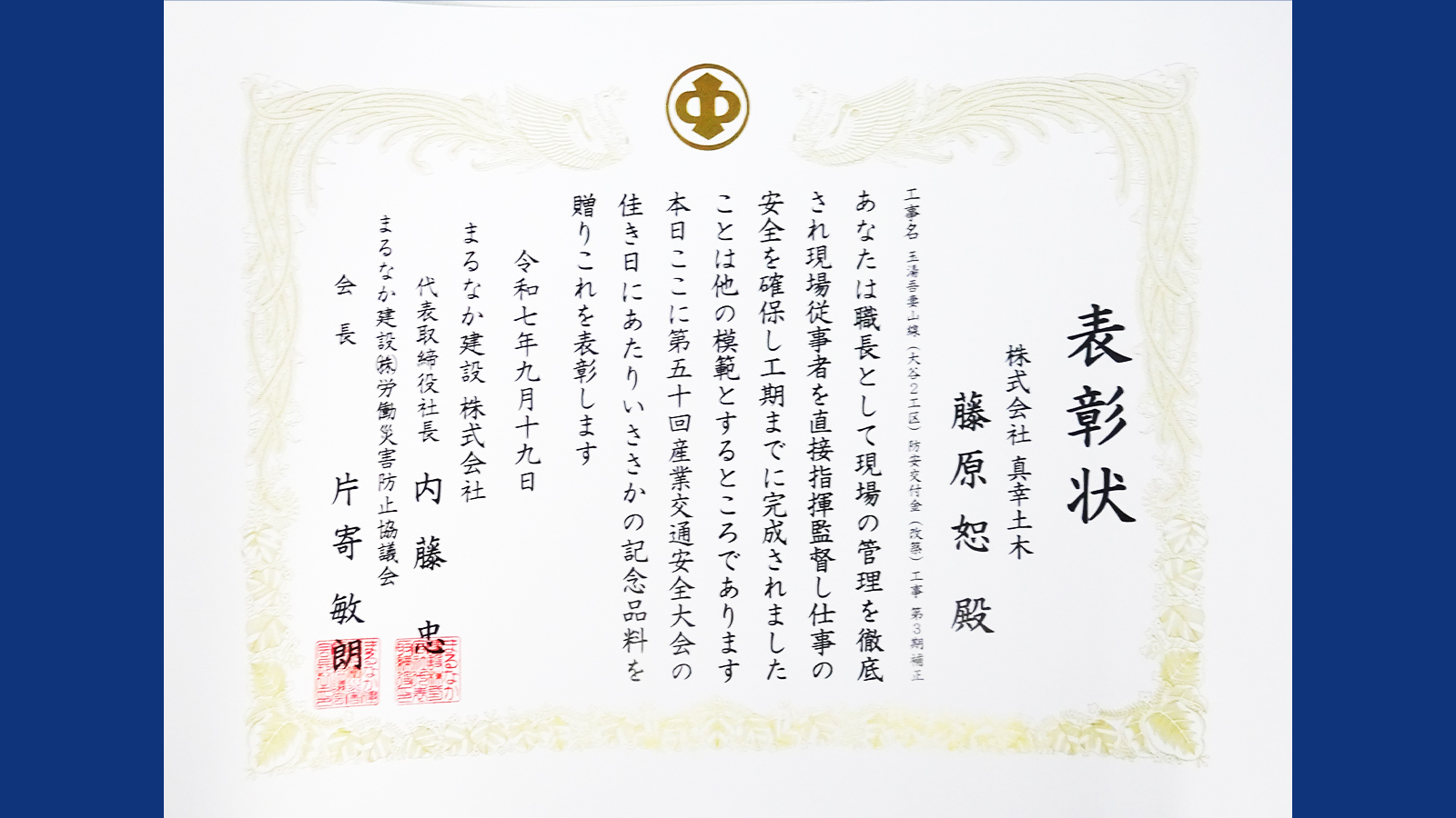 松江市長より松江市優良建設工事表彰を受賞しました。