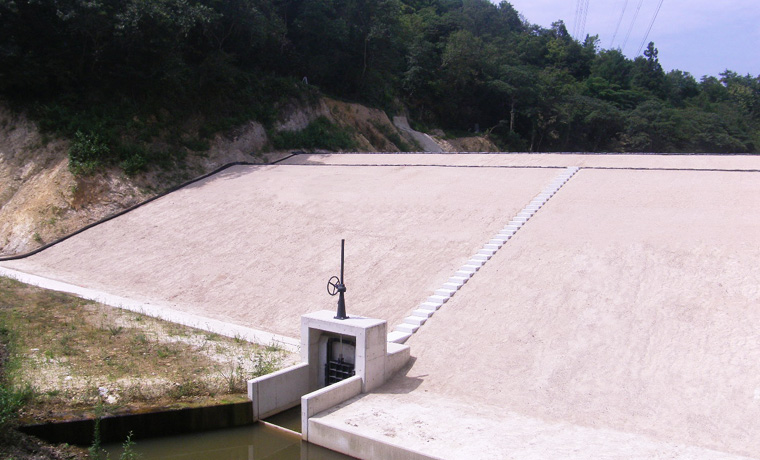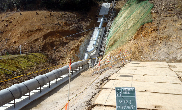 ①本工事は、松江市東出雲町地内のため池工事であり、主な工種は築堤盛土工、斜樋工、土砂吐BOX工です。