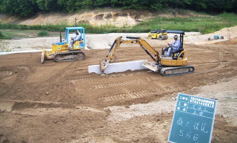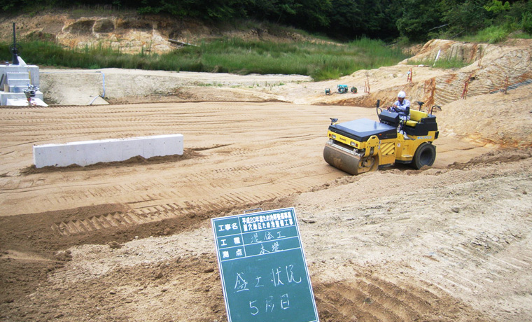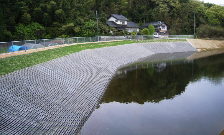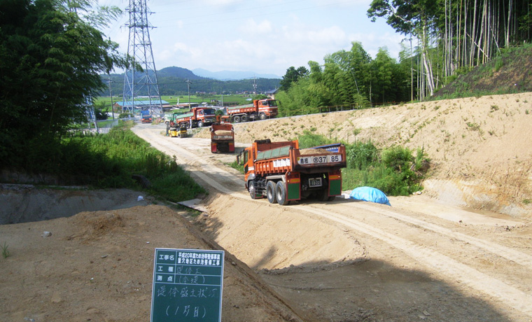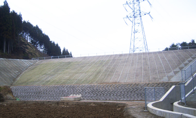 ①本工事は、松江市矢田町のため池工事であり、主な工種は堤体盛土工、洪水吐工、ブロックマット工です。