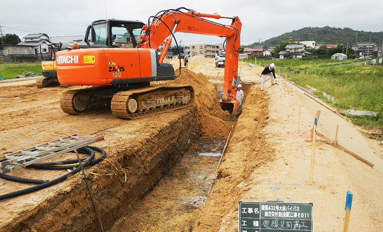 - ①本工事は、松江市東津田町地内の、道路改良工事であり、主な工種は土工、電線共同溝工、コンクリート構造物工、水路・管路工、軟弱地盤処理工です。