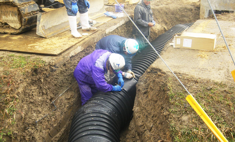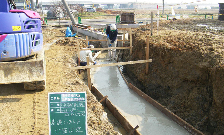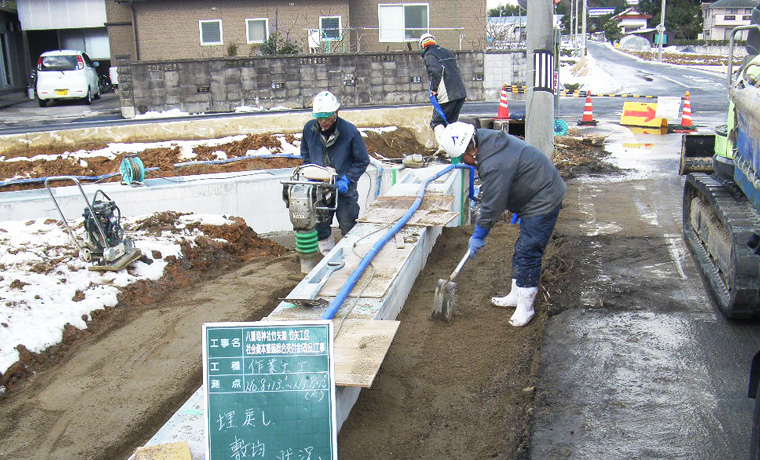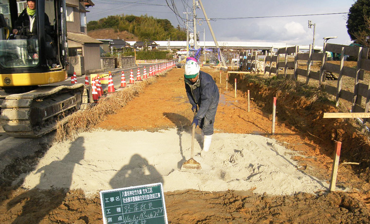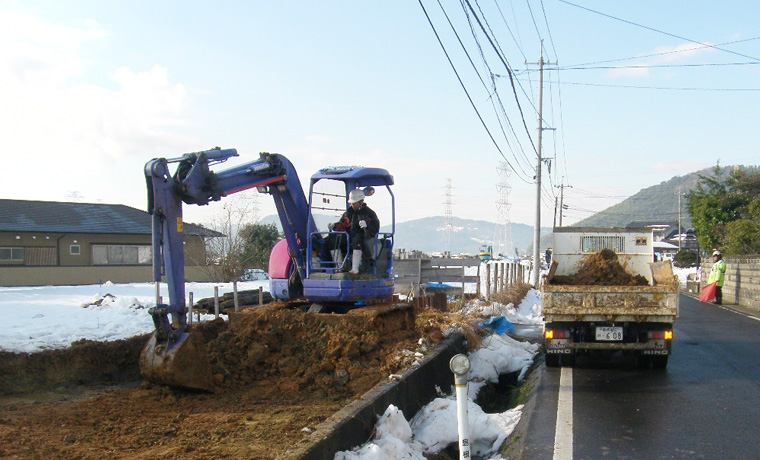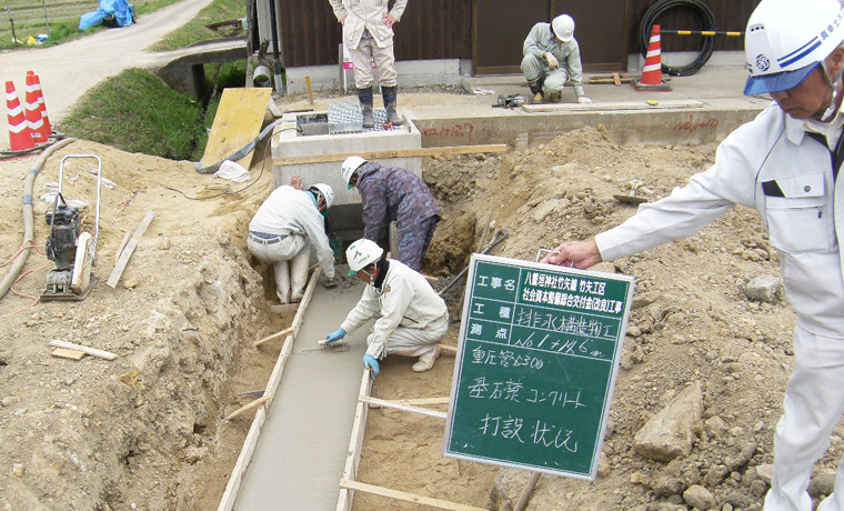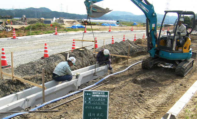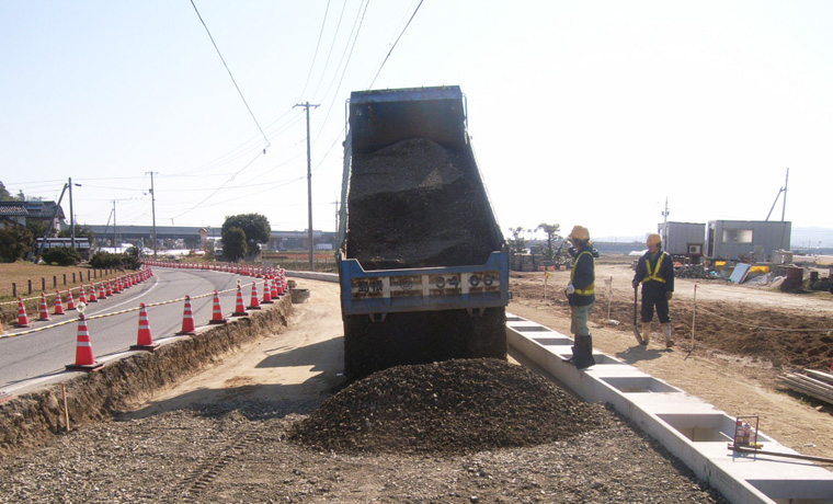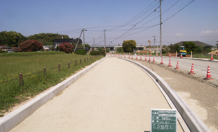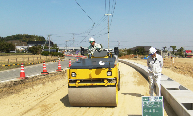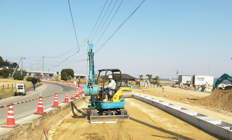 ①本工事は、松江市竹矢町地内の、道路改良工事であり、主な工種は土工、水路・管路工、構造物工、アスファルト舗装(路盤)工です。