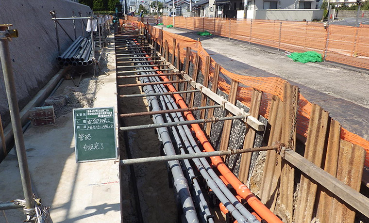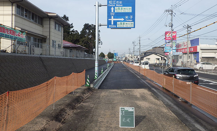 - ①本工事は、松江市古志原地内の、道路改築工事と電線共同溝工事であり、主な工種は道路土工、カルバート工、石・ブロック積(張)工、排水構造物工、縁石工、標識工、道路付属施設工、構造物撤去工、舗装工、区画線工、防護柵工、電線共同溝工です。