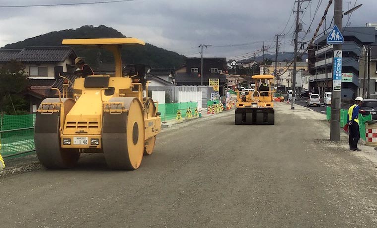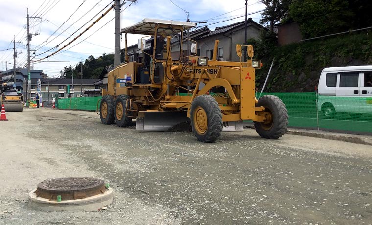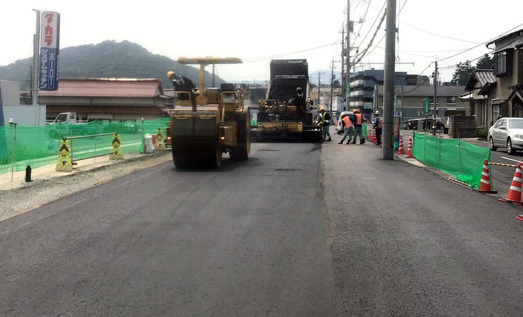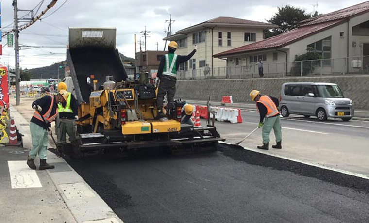 ①本工事は、松江市古志原地内の、道路改良であり、主な工種は舗装工及び電線共同溝工事である。
