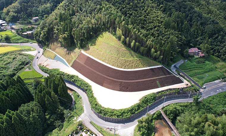 ①本工事は、松江市玉湯町大谷の道路工事であり、主な工種は道路土工、法面工、排水構造物工、である。