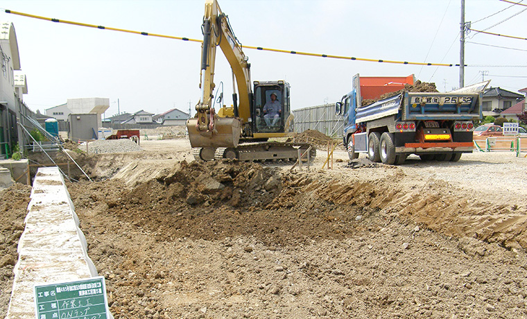 - ①本工事は、松江市東津田町の、道路改良工事であり、主な工種は土留め・仮締切工、コンクリート構造物工、軟弱地盤処理工、場所打杭等工です。