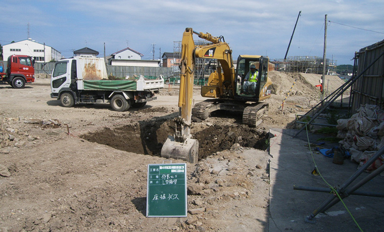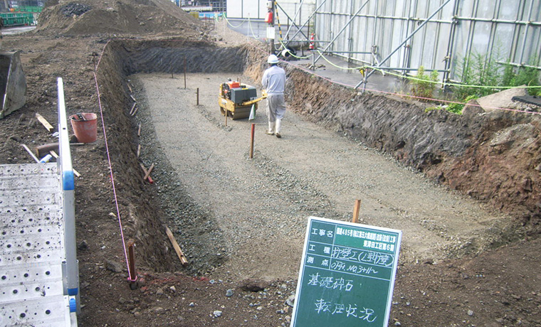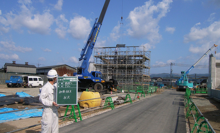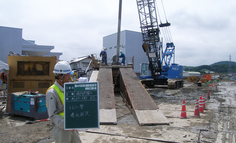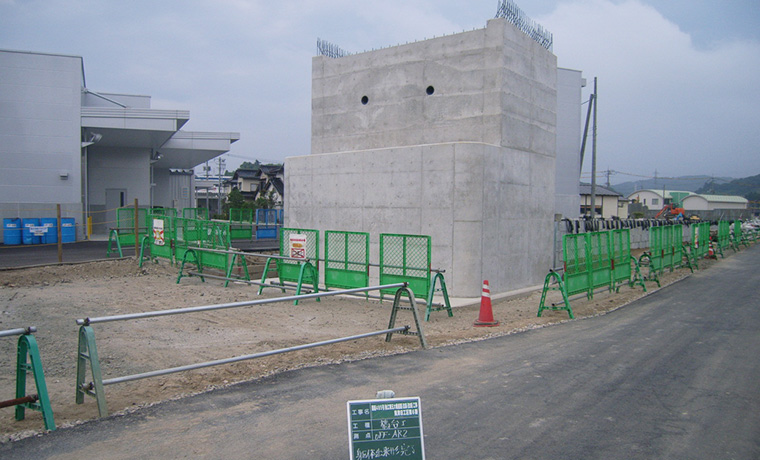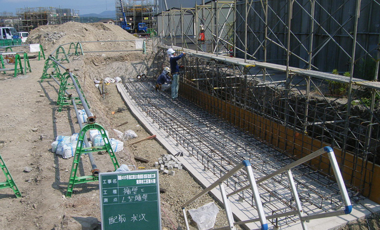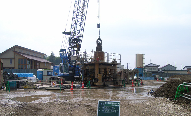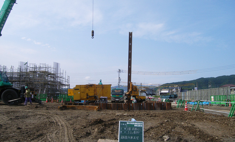- ①本工事は、松江市東津田町の、道路改良工事であり、主な工種は橋梁下部工、土留め・仮締切工、場所打杭工、土工、補強土壁工です。